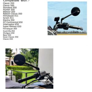 Compatible with Royal Enfield All Model Bikes Made From Premium Quality - HD Convex mirror attached on High-grade Aluminum & Nylon Body Mounted With Aluminium Rod, Black powder coating protects against rust and wear over time. Strong, and built to last quality Enhanced Visibility: 360° adjustability ensures you can position the mirrors to eliminate blind spots and achieve the best possible view, making every ride safer by improving awareness of surrounding traffic and obstacles. Easy to Install & Remove, Product needs to be installed with help of professional fitment Stylist Look - Finest Finishing
